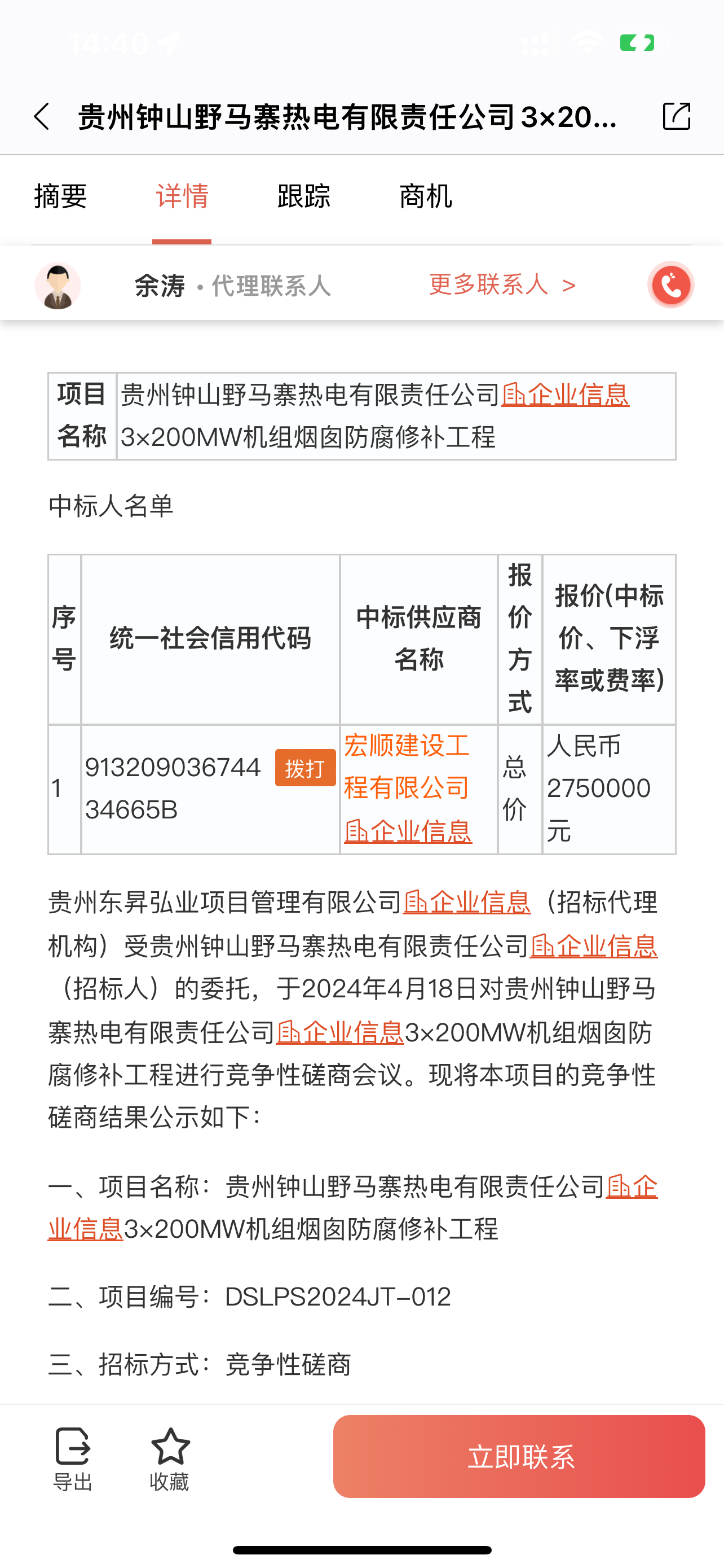 热烈祝贺我公司中标贵州钟山野马寨热电机组烟囱防腐修补工程项目